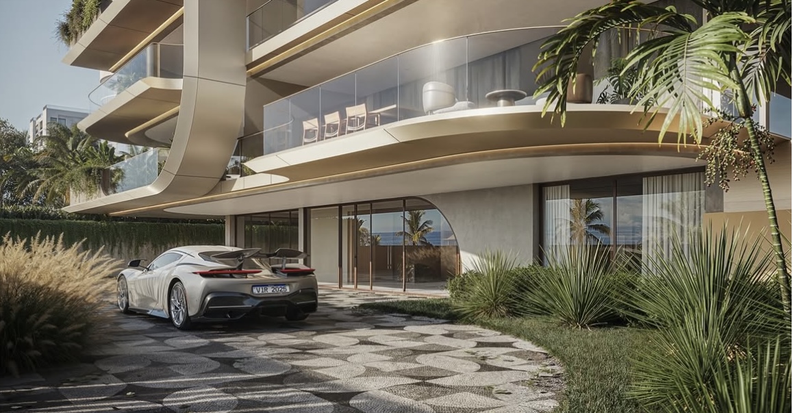 A fachada, desenhada com o DNA da Pininfarina, apresenta linhas fluidas e aerodinâmicas, que remetem ao movimento e à leveza do vento. Cada detalhe foi pensado para criar uma experiência sensorial, em que a luz, os materiais e as proporções se equilibram em harmonia perfeita.